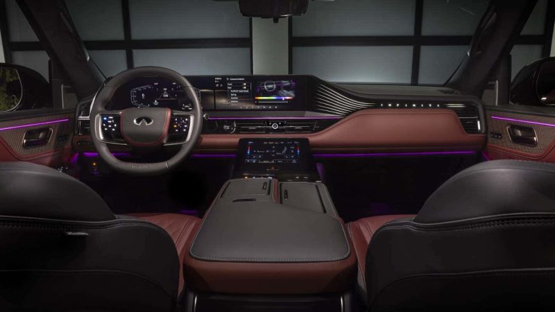 Inside, the QX80’s cabin has been transformed into a true luxury space, featuring premium materials like semi-aniline leather, open-pore wood trim, and matte chrome accents. The dual 14.3-inch touchscreen system with Google built-in ensures that navigation, music, and vehicle controls are always within reach, while heated seats and a multi-zone climate control system create a warm, inviting atmosphere—perfect for escaping the cold.